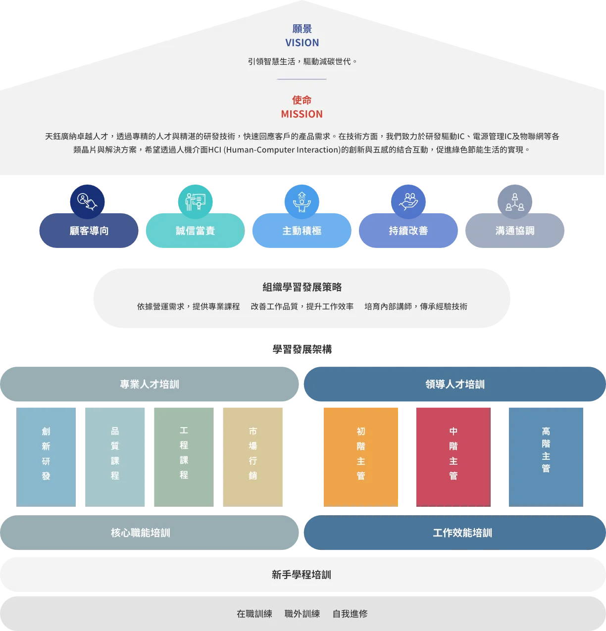 以五大核心職能 : 「顧客導向」、「誠信當責」、「主動積極」、「持續改善」、「溝通協調」展開組織學習發展策略,希冀同仁透過在職訓練、職外訓練及自我進修,不斷提升個人工作效能,將專業知能妥善運用於職務中,並從實際執行之業務項目獲得工作成就感。組織提供多元的進修管道與資源,鼓勵同仁透過線上及實體課程活動,補強個人職能缺口並發展集團未來所需專業技能,及早儲備個人與團隊未來競爭力,實現個人與組織共同成長並達成營運績效之目標。