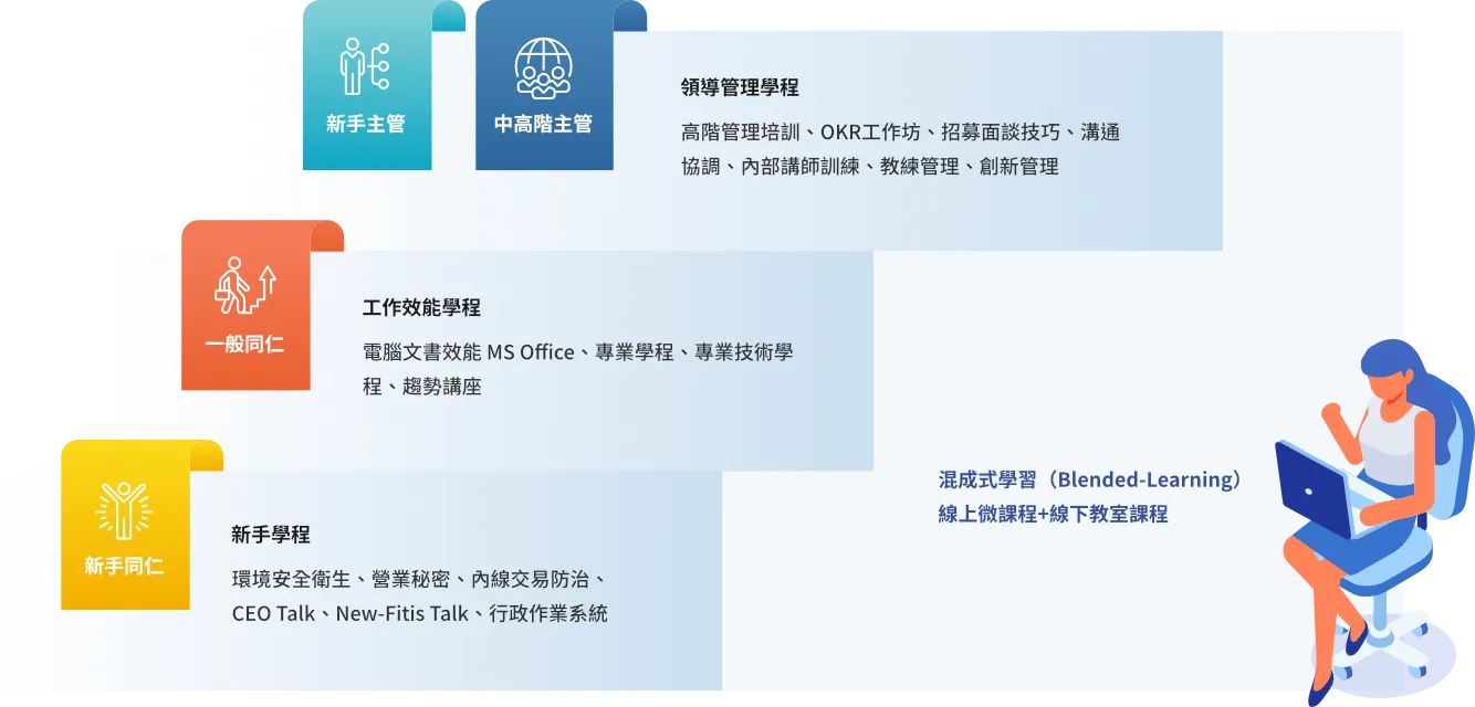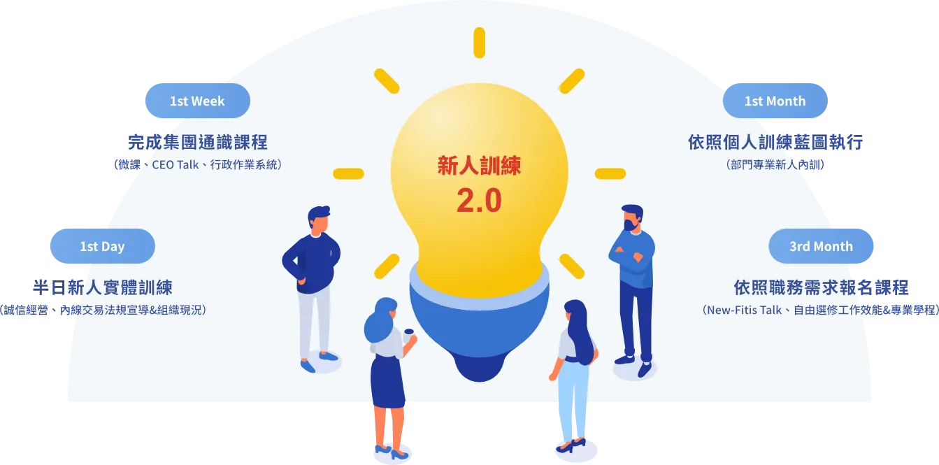 透過新人訓練導覽,協助新人快速認識組織營運現況、集團DNA及福利便利包 ; 以集團共同必修與部門新人必修課程,為新人量身打造專屬訓練藍圖,期望能協助新人快速認識組織與熟悉可運用之豐富資源 ; 同時,我們也重視新人的回饋,定期舉辦新人專場座談會(New-Fitis Talk),希冀能聽見多元的聲音與意見,一起攜手戮力為組織的成長貢獻心力。