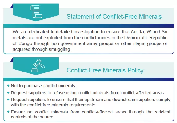 49 suppliers were investigated in 2021. The collection rate was 100%. According to the result of the investigation, all of the suppliers used 3TG minerals from RMI-certified smelters. There were a total of 125 qualified smelters.