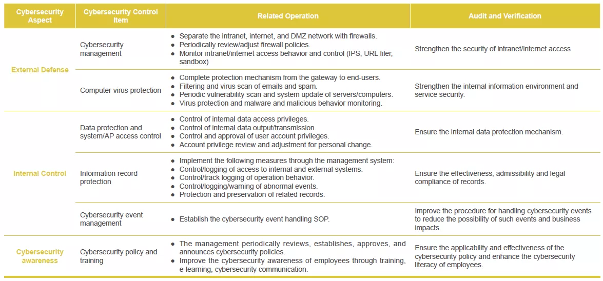 • Continue to build a comprehensive cybersecurity management system to eliminate the risk of financial impact and goodwill damage arising from cybersecurity events by implementing external defense, internal control and improvement of the overall cybersecurity awareness among the employees.