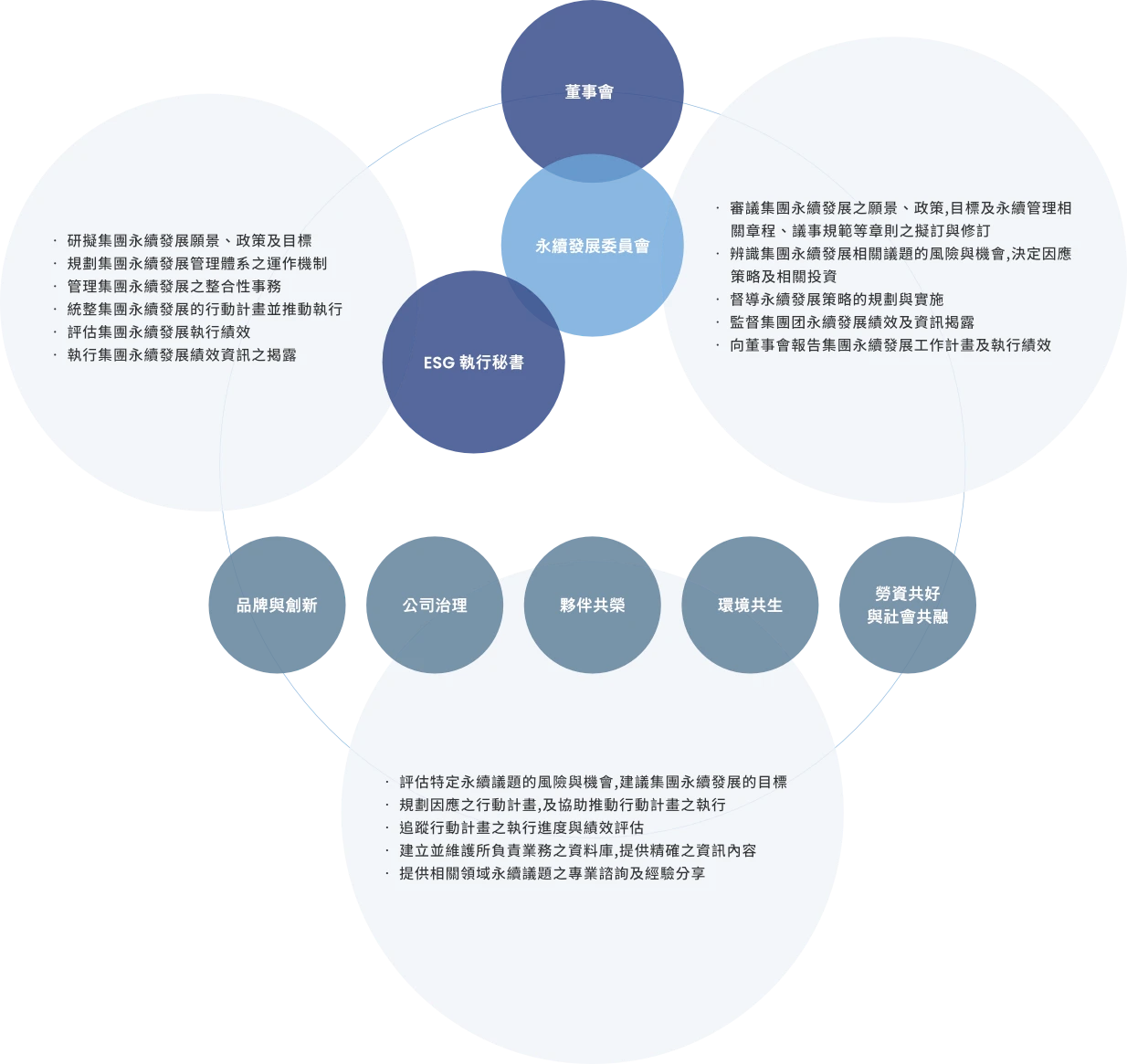 為實踐企業永續經營的願景,天鈺科技依本公司「永續發展實務守則」、「以發展委員會組織規程」規定,於2021年設置「天鈺科技永續發展委員會」及其權責,以督導及管理公司於環境、社會及治理面向之永續發展與推動,透過跨部門「垂直整合」與「水平分工」各司其職。該委員會隸屬董事會,為功能性委員會,由董事長擔任主任委員,委員會成員包括總經理及3名獨立董事,每年至少召開 2 次會議,將永續發展執行情況一年一次上呈董事會審查並對外發布。為有效執行並傳達各項永續發展事項,於永續發展委員會下設置ESG專責團隊(ESG 執行秘書)及「品牌與創新」、「公司治理」、「夥伴共榮」、「勞資共好與社會共融」、「環境共生」五大任務小組,定期審視年度永續推動成果,並策略規劃未來目標。
