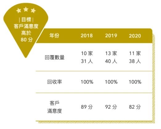 產品於售後服務、品質與安全方面,能獲得客戶及使用者的滿意及肯定;在發展員工人權、誠信道德及環境保護等永續議題上,更進一步要求至供應鏈,建立經濟、社會與環境相互依存的永續夥伴關係。