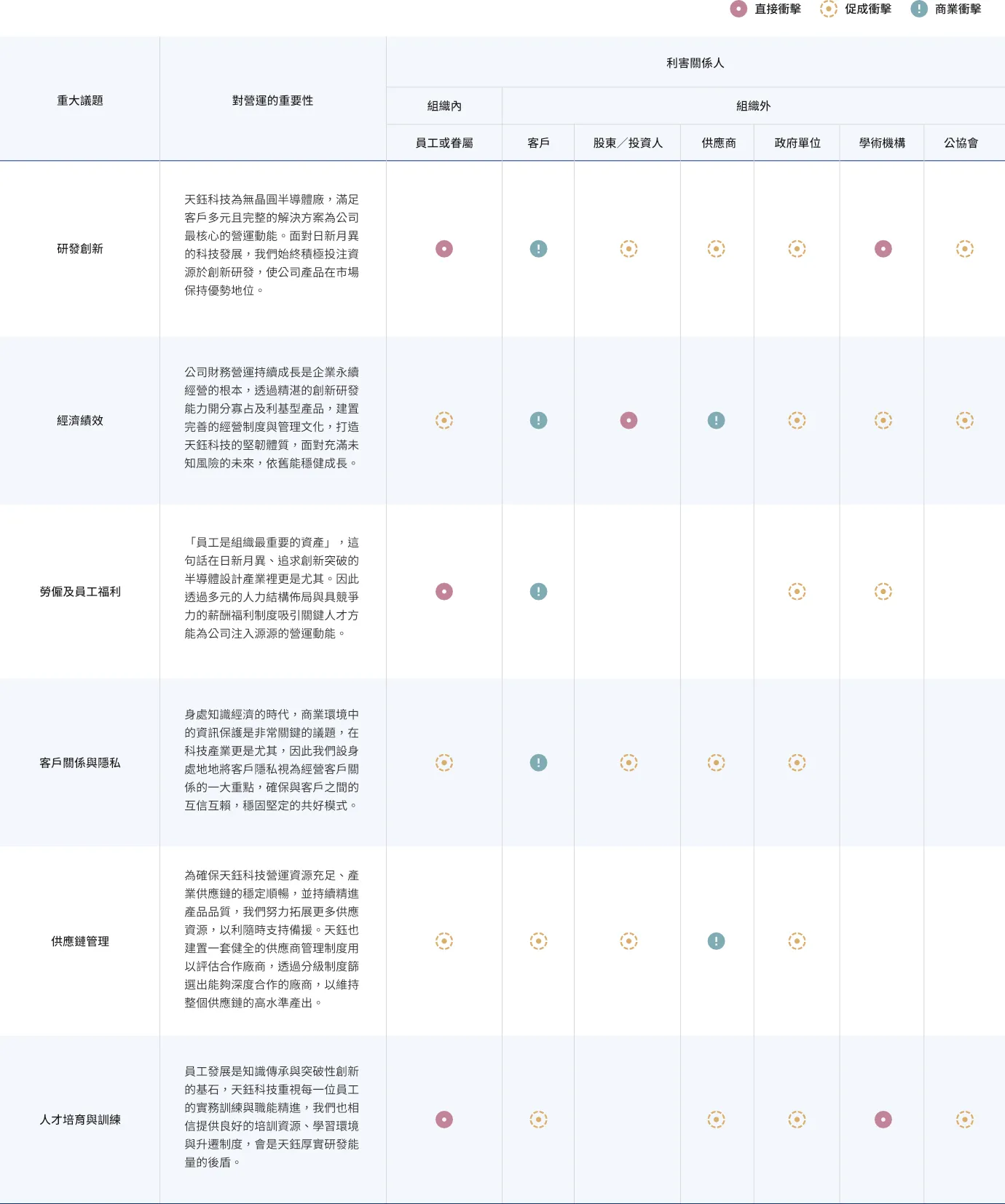 天鈺科技與利害關係人溝通後,收集其關注議題並依據永續性脈絡、重大性、完整性及利害關係人包容性,